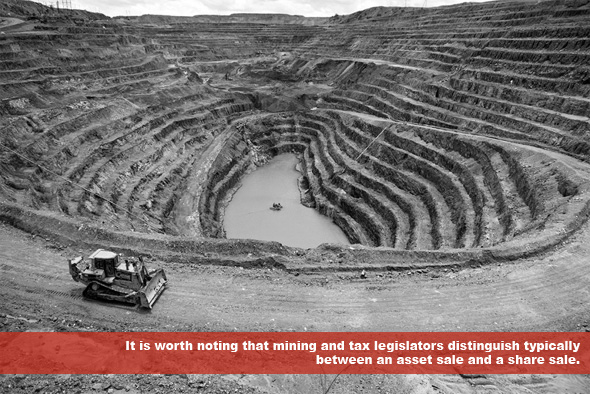 It is worth noting that mining and tax legislators distinguish typically between an asset sale and a share sale. When a mining asset located in country A is sold, both domestic law and tax treaty provisions generally allow for the taxation of the potential gain from the disposition of the local asset. However, the situation becomes tricky when the asset sold is legally owned by a company established in country B. This is especially the case when the ultimate shareholder (located in country B) sells the shares in its domestic subsidiary located in country A. A similar situation arises when the ultimate owner (in country B) sells the shares in its asset-owing subsidiary established in a country other than country A. When the asset-owing subsidiary is in a low-tax country, the sale of the shares would result in shifting the profits from the country in which the asset is located to the low-tax country. Basically, if a company sells a mining asset located in another country via a share transaction, it is an indirect transfer of the underlying asset (as opposed to a direct transfer of assets).