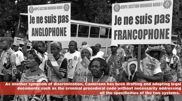 As another symptom of discrimination, Cameroon has been drafting and adopting legal documents such as the criminal procedural code without necessarily addressing all the specificities of the two systems. Even more concerning, quite a  number of French-speaking judicial and legal officers, were appointed to serve in the English speaking regions without necessarily being able to speak English or master relevant Common Law principles.[7]