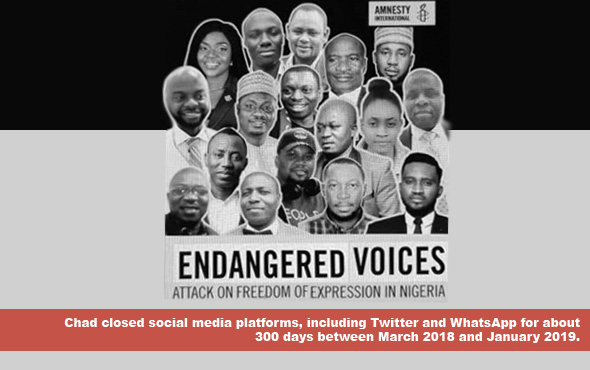 Chad closed social media platforms, including Twitter and WhatsApp for about 300 days between March 2018 and January 2019. The social media block started on Mar. 28, 2018 following increased tensions after a national conference of politicians and traditional chiefs recommended constitutional changes that would allow President Idris Déby to rule until 2033. Similarly, in a recent move, the Nigeria government introduced the Protection from Internet Falsehoods, Manipulation and Other Related Matters bill that would further stifle the space for critics, human rights reporting and accountability in the country. For example, part 5 of the bill poses a huge threat to online freedoms as internet intermediaries, including social media companies which are put under pressure to conform to regulations that clearly violate the enjoyment of free speech.