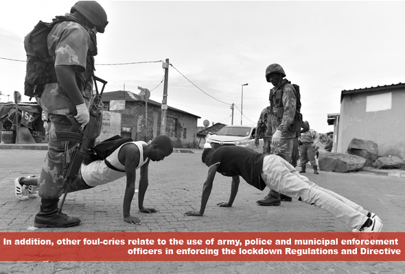 It hereby argued that, in cases where a member of the public is deemed to be in breach of the lockdown Regulations and Directives to the extent that the situation warrants his or her arrest, the designated enforcement officers have to effect the arrest in full compliance with the applicable laws, more in particular, the Criminal Procedure Act 51 of 1977 and Prevention of Combating and Torture of Persons Act 13 of 2013. Where a minimum use of force is inevitable, the enforcement officers should do so without exceeding the required legal parameters for using force in order to effect arrest. In other words, the enforcement of the lockdown Regulations and Directives should not result in the violation of the right to life or the freedom of security due to physical violence exerted by enforcement officers. Besides, there are numerous reports which depict the enforcement officers indulging in using various tactics of punishments on members of the public who have breached lockdown Regulations and Directives. For example, a video emerged on the internet showing soldiers punishing a group of men who failed to be confined at home by forcing them to repeatedly roll in the ground while onlookers cheered on (from the windows of their homes).