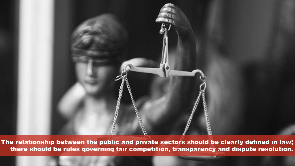 - service or utilities delivery – The relationship between the public and private sectors should be clearly defined in law; there should be rules governing fair competition, transparency and dispute resolution.