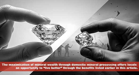 Mandatory mineral beneficiation requirements are therefore a necessary and legitimate tool to drive positive economic outcomes. The maximisation of mineral wealth through domestic mineral processing offers locals an opportunity to “live better” through the benefits listed earlier in this article. Mineral beneficiation programmes will allow the domestic population to capture greater value from their resources which will eventually lead to economic development contingent on trained human capital and adequate linkages to the domestic economy. This was demonstrated in Botswana, where diamond beneficiation programmes led to the creation of jobs, in addition to domestic diamond cutting and polishing industries.
